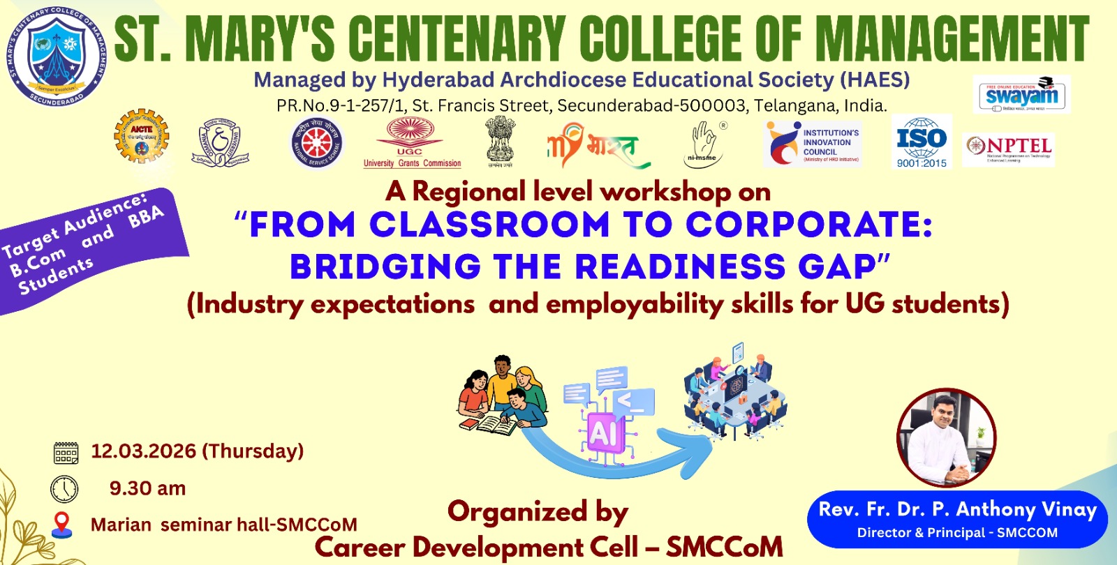 St. Mary’s Centenary College of Management, Secunderabad is organizing a Regional Level Workshop on “From Classroom to Corporate: Bridging the Readiness Gap” for B.Com and BBA students on 12 March 2026 at 9:30 AM in Marian Seminar Hall, SMCCoM.