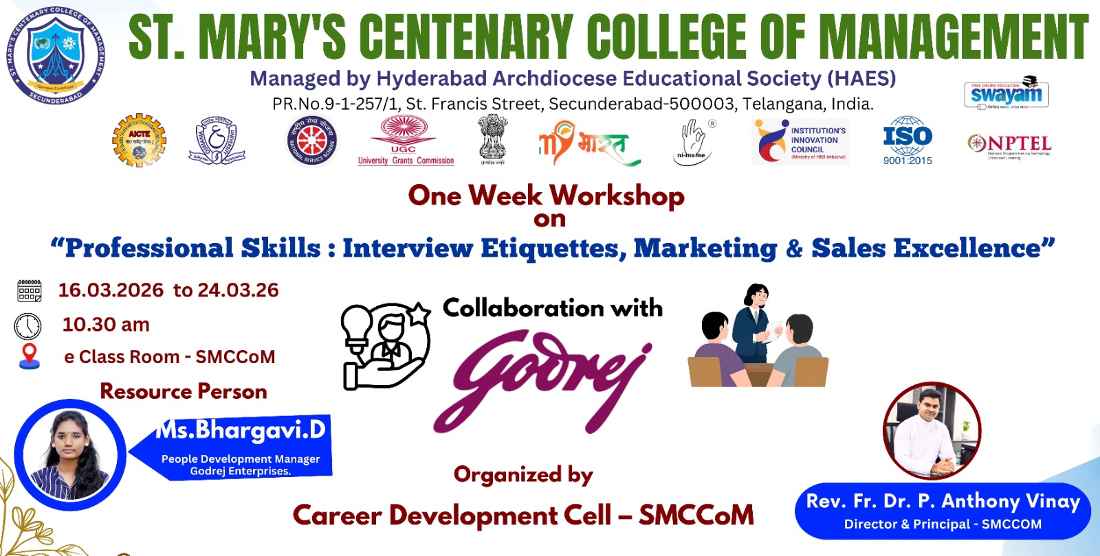 St. Mary’s Centenary College of Management (SMCCoM), Secunderabad, is organizing a One Week Workshop on “Professional Skills: Interview Etiquettes, Marketing & Sales Excellence” from 16th March 2026 to 24th March 2026 at 10:30 AM in the e-Classroom.