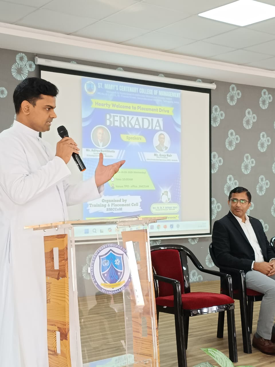 St. Mary’s Centenary College of Management (SMCCoM), Secunderabad, successfully hosted a two-day Campus Placement Drive in collaboration with Berkadia, a global leader in real estate and mortgage services, on 24th & 25th September 2025. The event was inaugurated by Rev. Fr. Dr. P. Anthony Vinay, Director & Principal, SMCCoM, who welcomed the Berkadia team and encouraged students to seize the opportunity. Distinguished speakers Mr. Aditya Kuchibhotla (Vice President – Primary Servicing) and Mr. Anup Nair (Vice President – Global Production Operations) shared valuable insights into Berkadia’s operations, work culture, and career growth prospects in the finance sector. The recruitment process included multiple assessment rounds—MCQ test, essay writing, and personal interviews—designed to evaluate cognitive, analytical, and communication skills. MBA (Finance) students actively participated, gaining real-world exposure and industry knowledge. The placement drive concluded successfully, marking another milestone in SMCCoM’s mission to empower students with practical opportunities and strengthen its industry-academia collaboration.