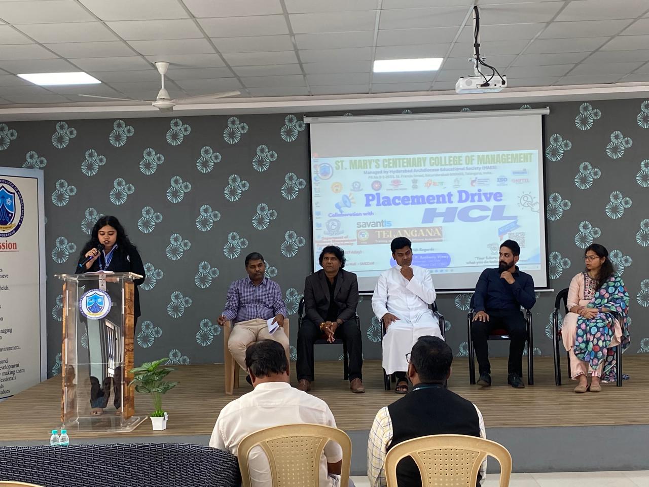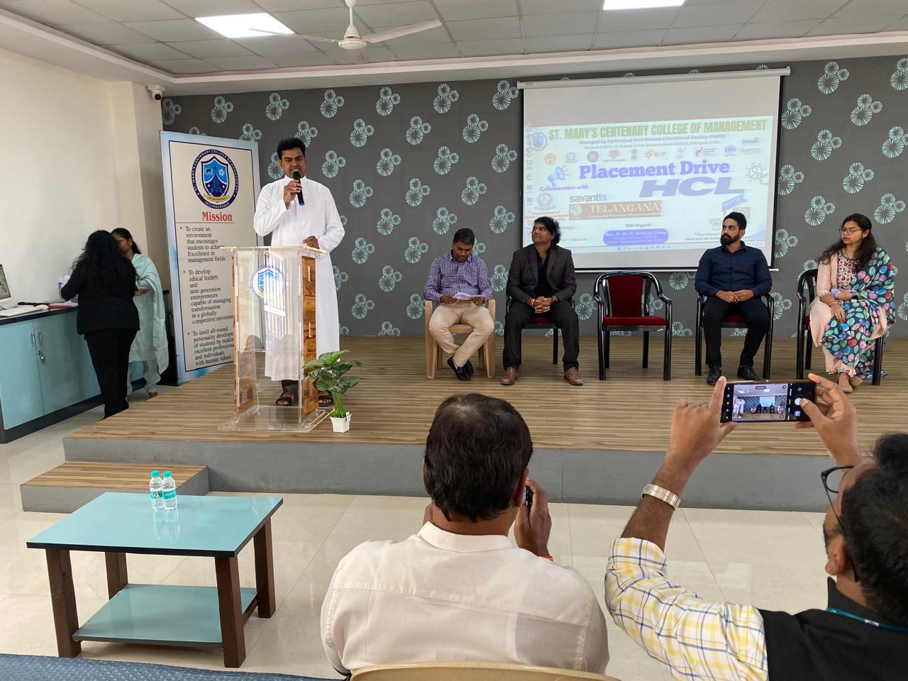 St. Mary’s Centenary College of Management (SMCCoM), Secunderabad, successfully organised a Placement Drive conducted by Savantis Solutions LLC for its client HCL on 23 January 2026 at the Marian Seminar Hall. The drive was coordinated by the Career Development Cell (CDC) with the aim of enhancing students’ employability and strengthening industry–institution collaboration. The programme began with a brief inaugural session, graced by Rev. Fr. Dr. P. Anthony Vinay, Director & Principal, SMCCoM; Dr. Jayram, President, Telangana Training and Placement Officers Association (TTPOA); Sri Revanth, Head – HR, Savantis Solutions; and Sri K. Shyam Kumar Reddy, HR Manager, Savantis Solutions. The dignitaries addressed the gathering and shared insights on career readiness, industry expectations, and professional growth. Following the inaugural session, the placement drive commenced with active participation from nearly 250 students from various colleges. The recruitment process was conducted in three stages: a Group Discussion round, followed by a Technical round, and concluding with the HR round. The structured selection process enabled students to demonstrate their communication skills, technical knowledge, and suitability for corporate roles. The placement drive provided valuable exposure to real-time recruitment practices and served as an effective platform for students to take a confident step towards their professional careers. The event concluded successfully with appreciation extended to Savantis Solutions LLC, HCL, and all stakeholders for their support. “Your future is created by what you do today, not tomorrow.”